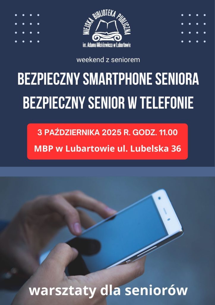 BEZPIECZNY SENIOR W TELEFONIE Posted on 2025-09-302025-10-10 By moderator Brak komentarzy do BEZPIECZNY SENIOR W TELEFONIE Zapraszamy do Miejskiej Biblioteki Publicznej ul. Lubelska 36, która organizuje w dniu 03.20.2025 r. (piątek) o godz. 11.00 warsztaty dla seniorów „BEZPIECZNY SENIOR W TELEFONIE” Ogłoszenie, Zaproszenie