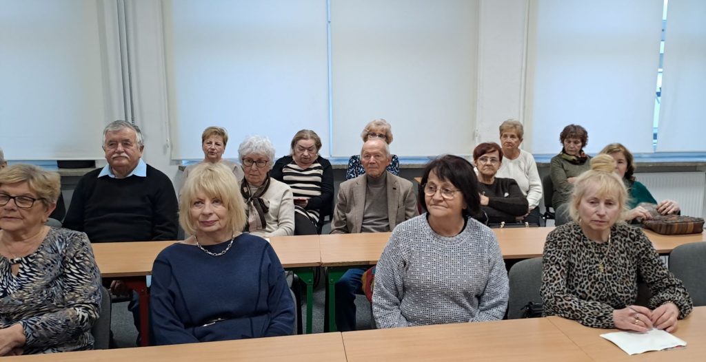 Na zakończenie, nasza kol. prezes UTW Ludmiła Romaneczko wraz z podziękowaniem wręczyła miłą pamiątkę wykonaną przez słuchaczki na zajęciach rękodzieła artystycznego – oprawione nuty kolędy „Lulajże, Jezuniu”..