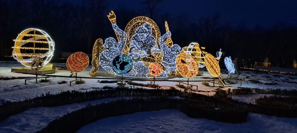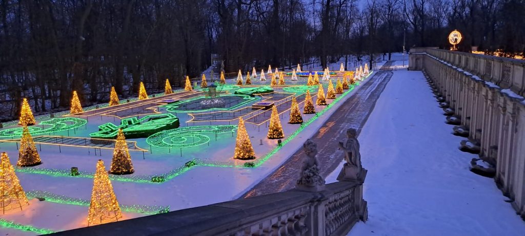 Po tych telewizyjnych emocjach pojechaliśmy do Wilanowa, gdzie mogliśmy podziwiać iluminacje Królewskiego Ogrodu Światła, które znajdowały się w parku wokół pałacu Jana III Sobieskiego. Były piękne, szczególne wrażenie robił ogród pełen wielkich czerwonych kwiatów-lampionów oraz dolny taras, gdzie świetlne rabaty kwiatowe pulsowały wieloma kolorami w rytm muzyki. Szkoda tylko, że znad Jeziora Wilanowskiego i Wisły wiał lodowaty wiatr.