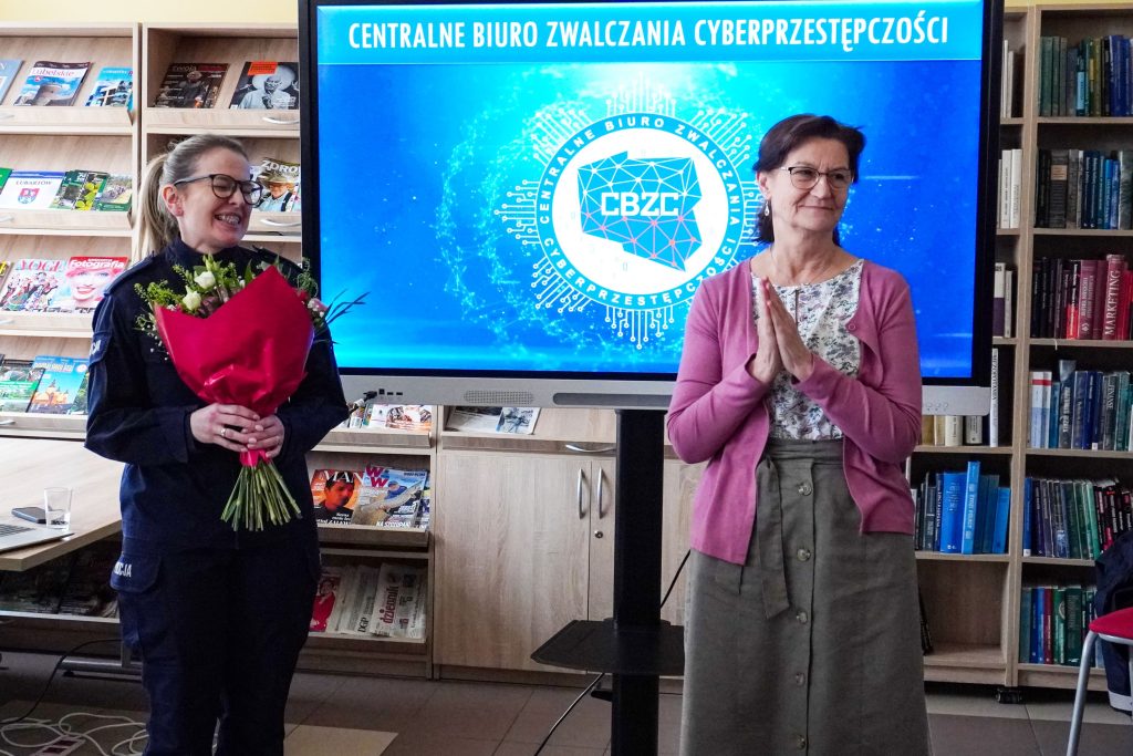 Główną prelegentką była pani Skowrońska, która na wstępie zapoznała słuchaczy z działaniami podejmowanymi przez CBZC, m.in. pracą operacyjną i śledczą, analizą kryptowalut i ruchu sieciowego. Wyjaśniła, na czym polega informatyka śledcza, jak CBZC wspiera jednostki Policji i jak prowadzi profilaktykę. Następnie podała dane statystyczne o typach i liczbie incydentów tj. oszustw, podkreślając, jak negatywnie wpłynęła pandemia na zwiększenie cyberprzestępczości. Jasno wytłumaczyła, na czym polegają takie oszustwa jak: phishing, SMShing, Vishing oraz co to są deepfaki, pokazując różne przykłady.